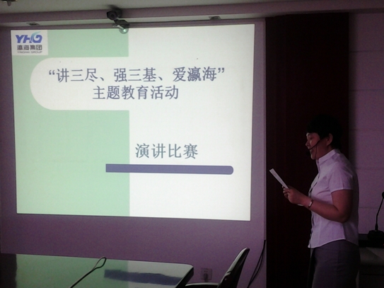 2012年5月30日,集團(tuán)總裁辦在總部會(huì)議室組織全員開展“講三盡、強(qiáng)三基、愛瀛海”演講賽活動(dòng),集團(tuán)機(jī)關(guān)共10位代表選手參加了此次演講賽。集團(tuán)常務(wù)副總裁陳琴、運(yùn)行管理部部長(zhǎng)倪宏山、銷售公司經(jīng)理馬君、人力資源部部長(zhǎng)馬麗霞、投資發(fā)展部經(jīng)理樓高峰及總裁辦主任王華擔(dān)任此次比賽的評(píng)委,總裁辦古玲芝主持整場(chǎng)比賽。